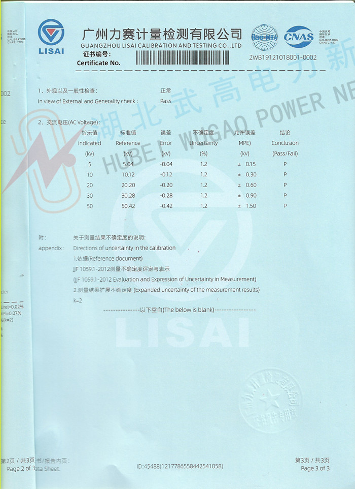 AC:50KV、100KV、150KV、200KV: DC:70KV、140KV、210KV